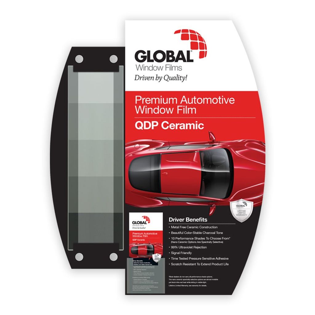 Väggmonterade väggdisplayer som levereras med allt du behöver för att marknadsföra Global QDP Ceramic solfilm.
