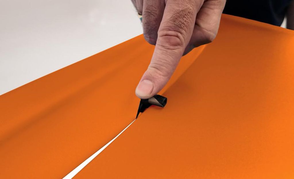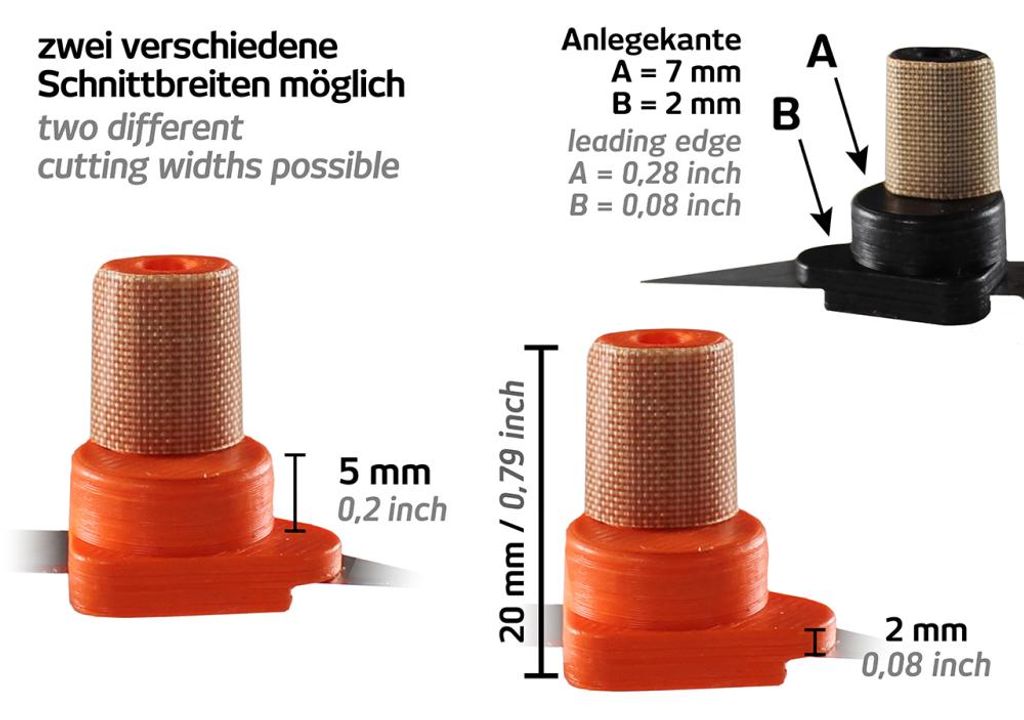 Verktyget har två integrerade distanser, vilket gör det möjligt att skära med antingen 2 mm eller 7 mm avstånd från kanten. Välj önskat mått, placera WrapTrooper mot kanten – och för den smidigt längs ytan medan bladet ger ett exakt snitt i rätt avstånd. För extra känsliga ytor medföljer en Teflon-platta som enkelt monteras på verktyget och skyddar underlaget.