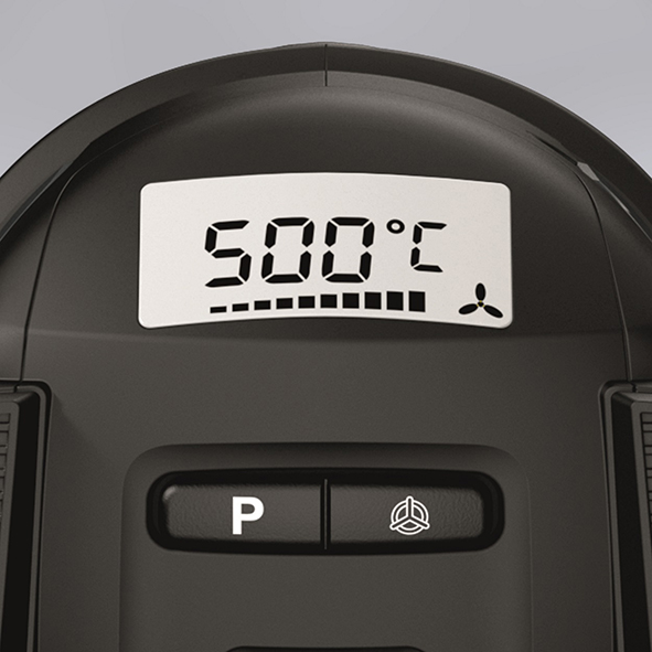 Ställbar temperatur 50-500°C i steg om 10°C samt luftflöde upp till 300 l/min. En LCD-display visar uppnådd temperatur.